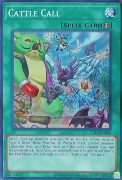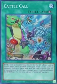 Send 1 face-up monster you control to the GY, whose original Type is Beast, Beast-Warrior, or Winged Beast; Special Summon 1 monster from your Extra Deck with the same original Type, but it cannot attack, its effects are negated, also it is destroyed during the End Phase. You can only activate 1 "Cattle Call" per turn.