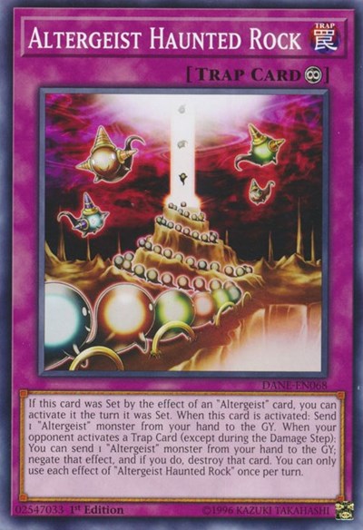If this card was Set by the effect of an "Altergeist" card, you can activate it the turn it was Set. When this card is activated: Send 1 "Altergeist" monster from your hand to the GY. When your opponent activates a Trap Card (except during the Damage Step): You can send 1 "Altergeist" monster from your hand to the GY; negate that effect, and if you do, destroy that card. You can only use each effect of "Altergeist Haunted Rock" once per turn.