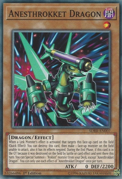 When a Link Monster's effect is activated that targets this face-up card on the field (Quick Effect): You can destroy this card, then make 1 face-up monster on the field unable to attack, also it has its effects negated. During the End Phase, if this card is in the GY because it was destroyed on the field by battle or card effect and sent there this turn: You can Special Summon 1 "Rokket" monster from your Deck, except "Anesthrokket Dragon". You can only use each effect of "Anesthrokket Dragon" once per turn.